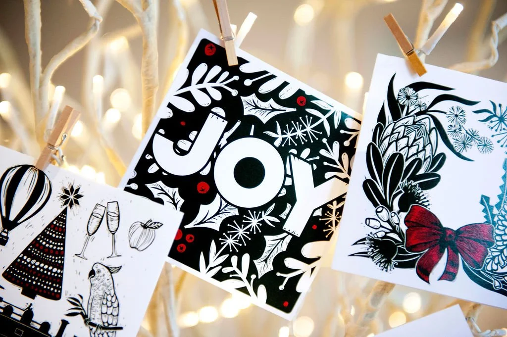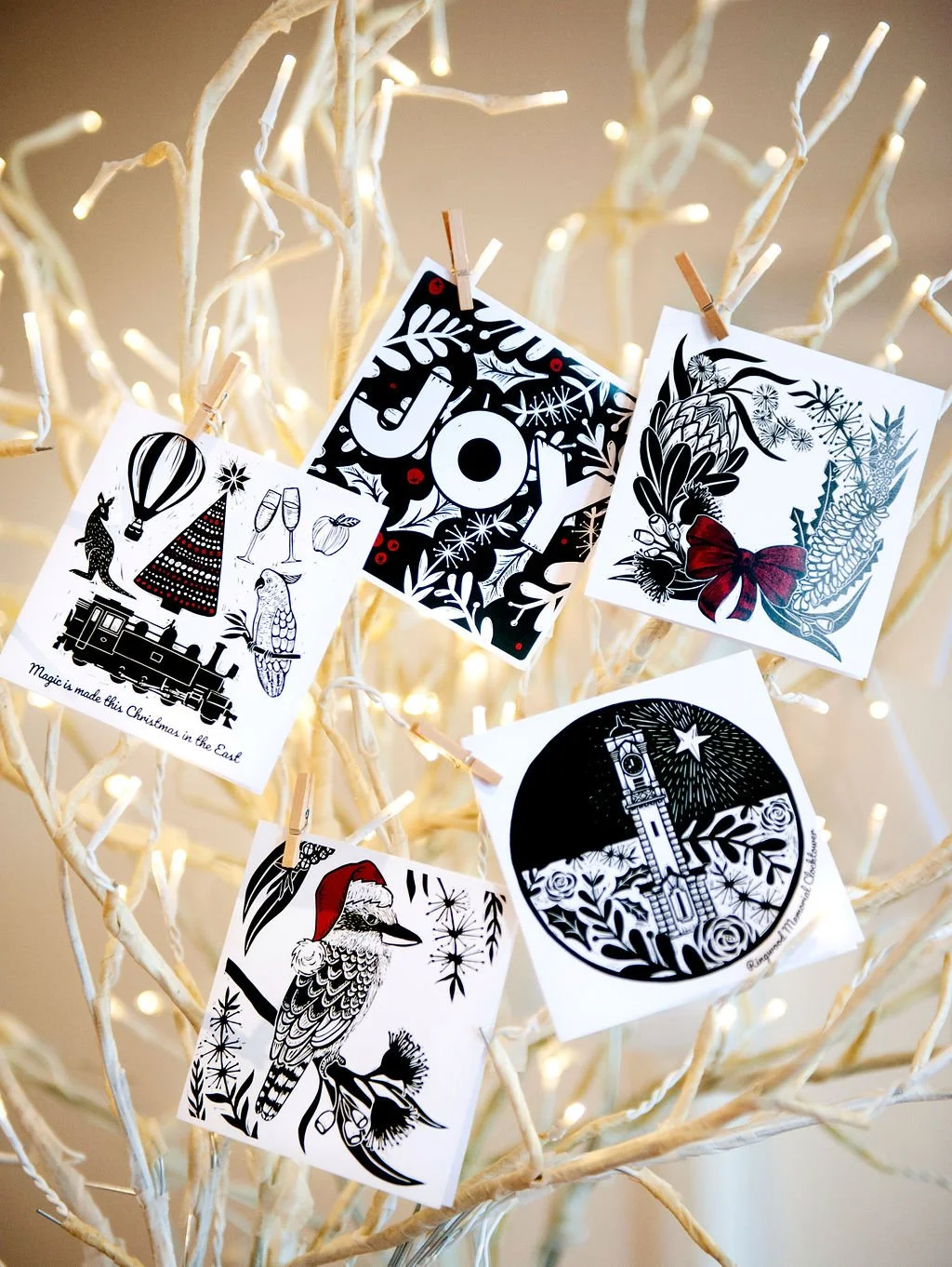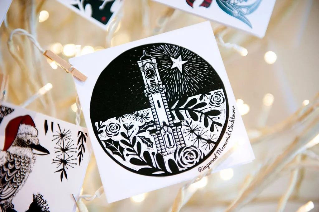 Eastland commissioned 5 Christmas card designs made from lino prints, to reflect the local area and festive spirit. The Ringwood Clock tower and the Yarra Valley symbols - Puffing Billy, local wildlife and produce.